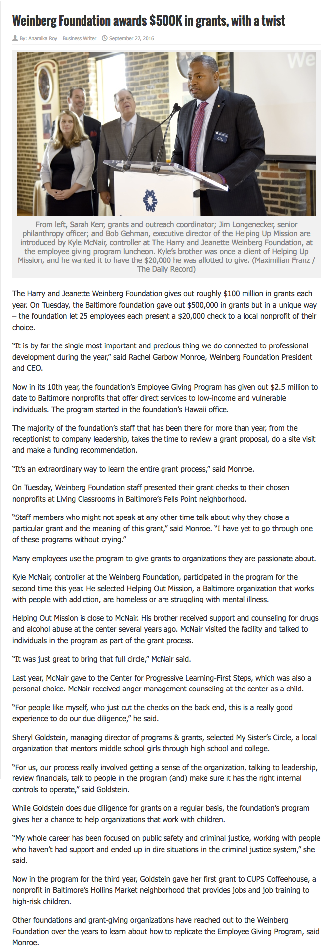 Weinberg Foundation, September 27, 2016 Sisters Circle was awarded a grant by the Weinberg Foundation! “It is by far the single most important and precious thing we do connected to professional development during the year,” said Rachel Garbow Monroe, Weinberg foundation President and CEO (Read more here) |